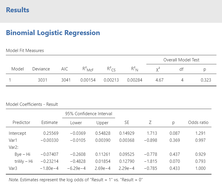Once you have defined the model, you can then run the logistic regression analysis. Jamovi will generate output that includes the coefficients for each independent variable, as well as their standard errors, confidence intervals, and p-values. This output can be used to interpret the results of the analysis.